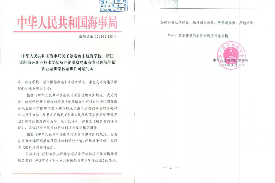 我校于2019年9月向海事主管机关申请新增培训项目,同年12月通过现场核验,2020年4月交通运输部海事局正式签发许可。此次新增2项特定航线江海直达船舶船员培训项目的获批,标志着我校船员教育和培训工作又上了一个新台阶,将大大提升学校服务江海联运、长江经济带发展的能力和水平。(文/航海工程学院、职业培训中心)