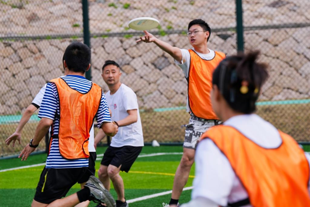 本次比赛采用5V5团体对抗模式,设置小组循环赛与单败淘汰赛双阶段赛制,既考验战术布局又需临场应变。赛场上,我校参赛青年身着统一队服化身“飞盘手”,他们眼神专注,精准完成一次次传接,在攻防转换的瞬间,巧妙突破对手防线。比赛中,无论是开场时的青涩试探,还是后期熟练协作下的极限得分,队员们始终以饱满的热情和昂扬的斗志投入其中,用顽强的团队凝聚力生动诠释了“盘不落地,永不放弃”的飞盘精神。