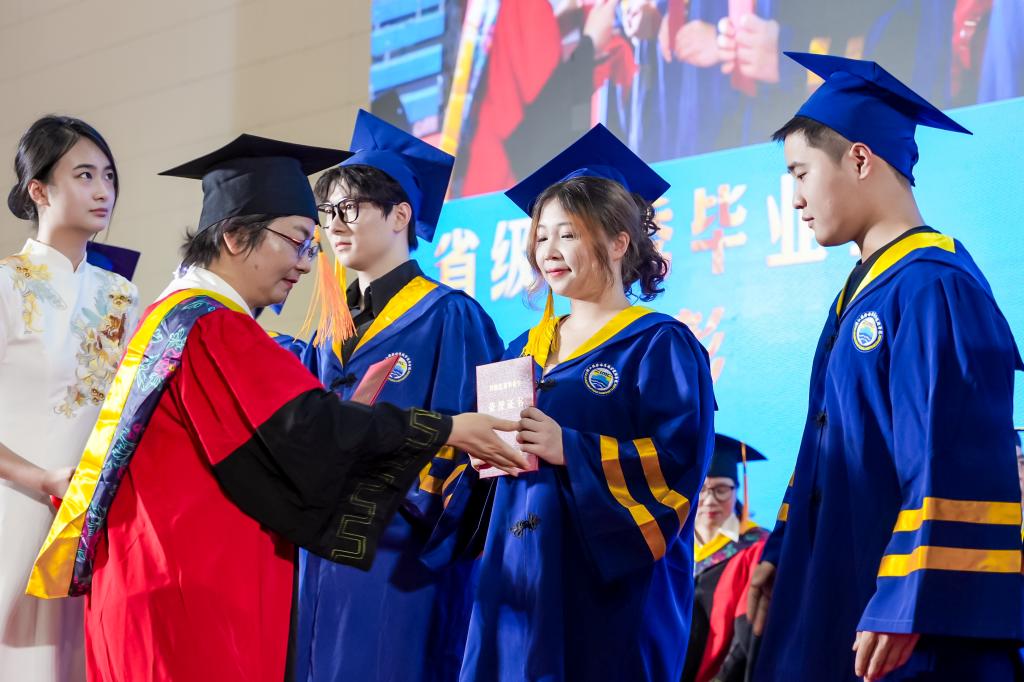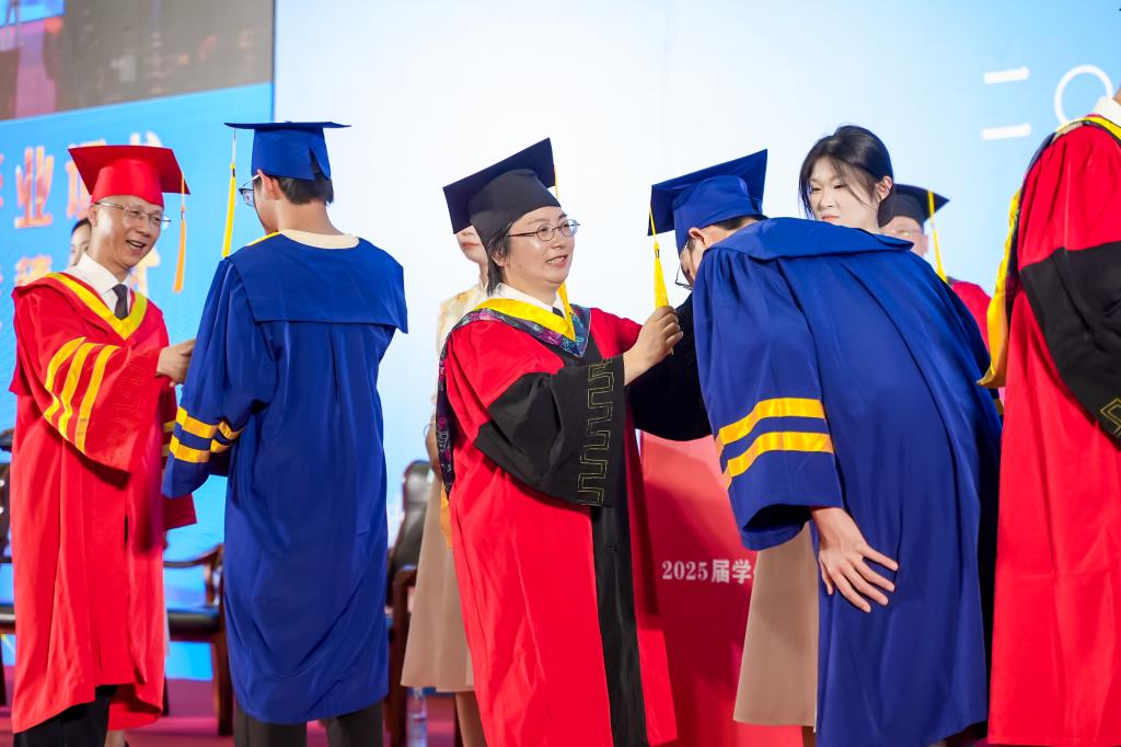 毕业典礼上,校党委副书记孔志光、副校长李丽为2025届省级优秀毕业生颁奖。