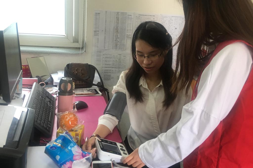 5月9日,志愿者拿着血压测量仪,为老师们测量了血压和心率,并送上了健康小贴士,希望老师们永远健康年轻,受到了老师们的一致好评。