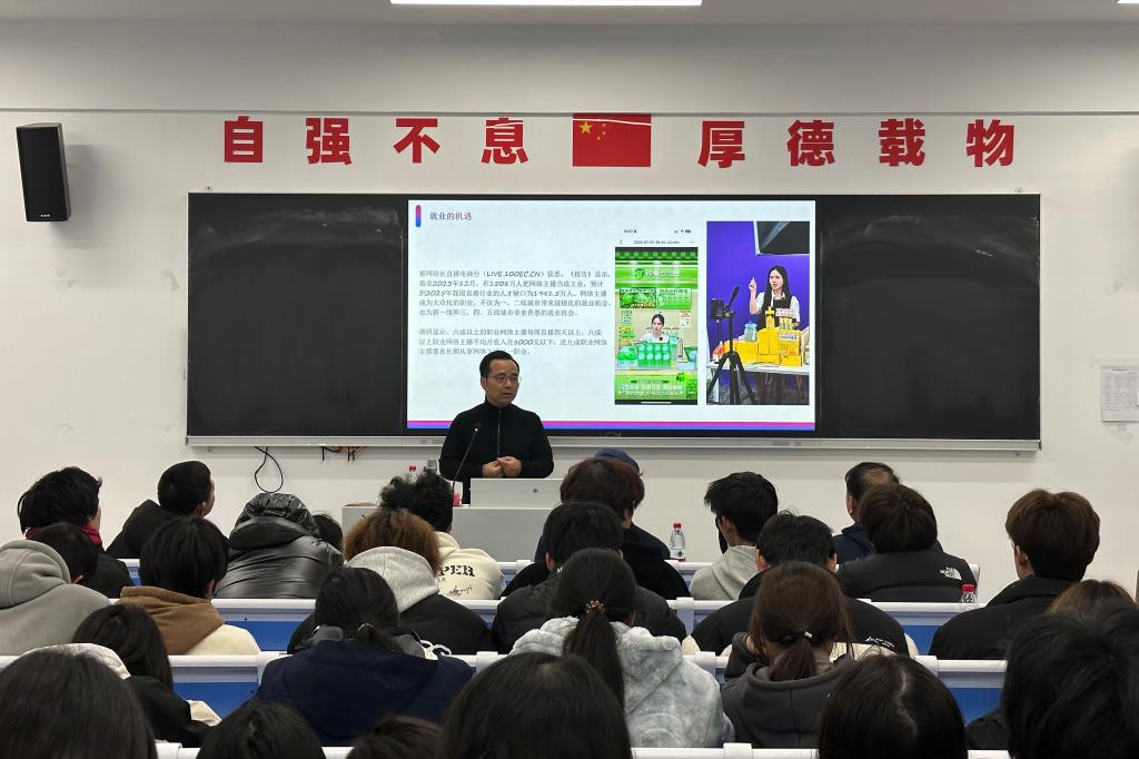 应中迪副教授结合了大量实战案例,围绕新媒体的变迁、创业与就业的机遇、新媒体运营策略、直播电商的选品技巧、直播间流量获取途径以及运营数据分析等多个维度,对直播电商领域所带来的广阔机遇进行了全面深入的讲解。参会人员纷纷表示,从中获得了丰富的知识和实践经验、受益匪浅。最后在互动环节,应中迪对学生们的提问进行了耐心细致的解答。