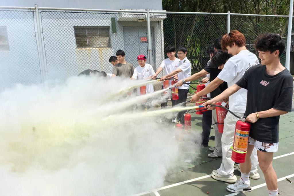 疏散完毕后,安保专业人员现场演示灭火器使用方法。“提、拔、瞄、压” 四字口诀配合规范的操作动作,让理论知识变得通俗易懂。在专业人员指导下,同学们纷纷上前亲身体验,将口诀转化为实际操作,进一步熟悉和掌握了灭火器的使用技巧。