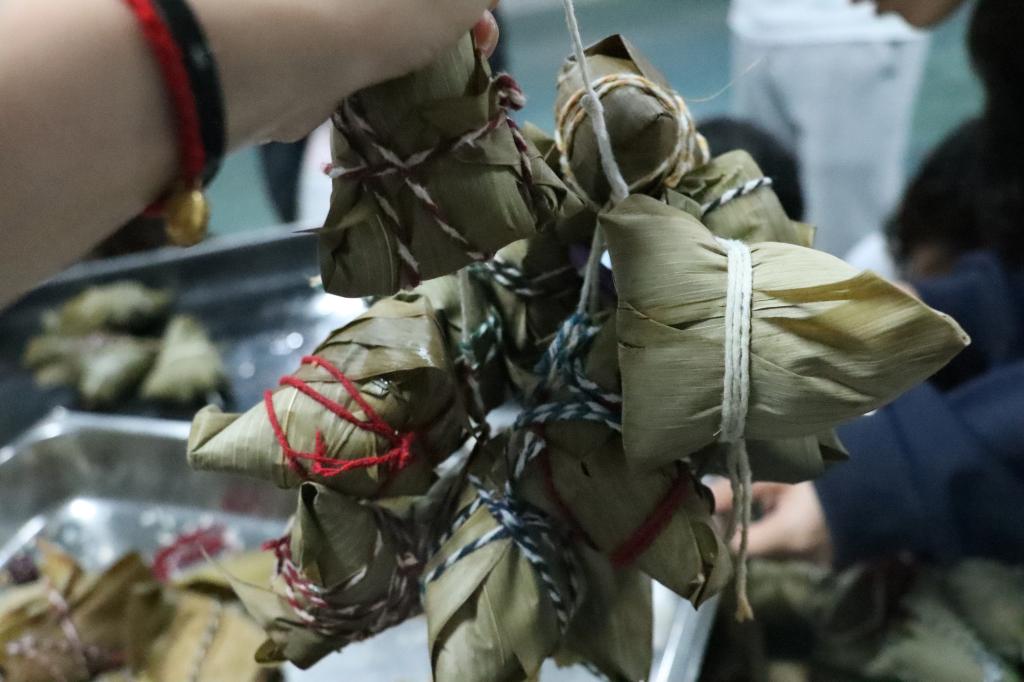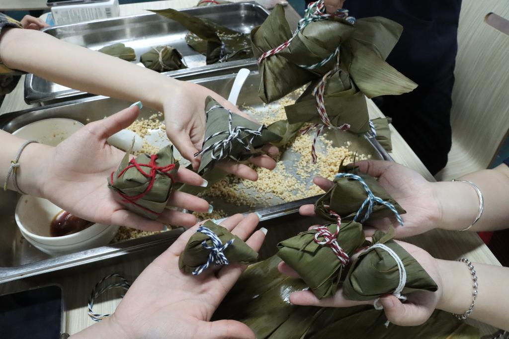 当天下午,活动参与者们齐聚学生食堂,以4-6人为一组,他们个个摩拳擦掌,各自挑选了甜、咸糯米,咸蛋黄、鲜肉、红枣、豆沙等馅料,在工作人员的细致教授下,同学们逐渐掌握了包粽子的要领,一个个或小巧或饱满的粽子逐渐成型,再扎上五彩的绳线,心中是满满的成就感。活动结束后,同学捧着蒸熟的粽子,眼里满是欣喜,纷纷表示要带回寝室送给自己的室友尝一尝。
