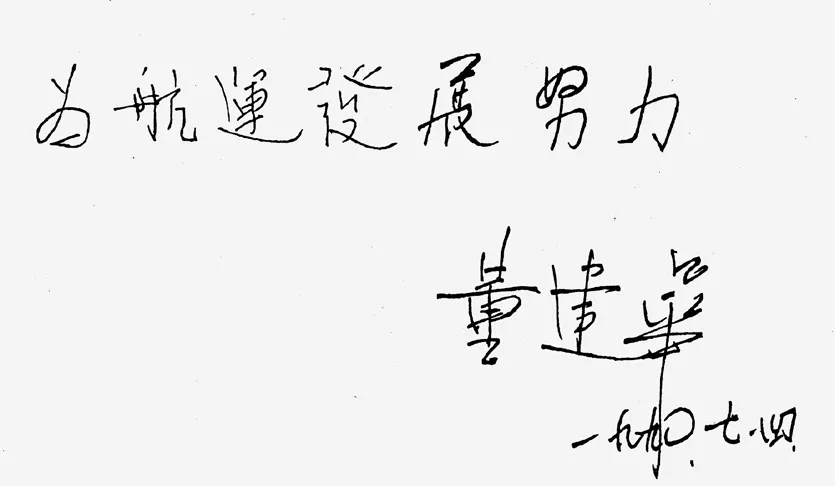 1990年7月4日下午,董建华先生与夫人一行首次回故乡省亲。他来到当时位于定海文化路上的舟山水产学校,整个校园沸腾了。当年的董建华先生,年过半百,身着深藏青色西装,留平顶头,气度轩昂又随和。董先生听取了学校创办历史和发展概况介绍,对这所家乡学校为培养海上交通、航运事业人才所开设的航海驾驶和轮机管理专业,极感兴趣,他颇为认真地询问了这些海上专业设置的具体情况和毕业生分配与工作去向,并应邀在贵宾留言簿上题写了“为航运发展努力”七字,以此共勉,表示“对家乡的学校,我一定会尽力相助”。