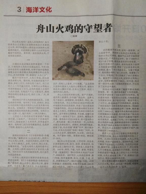 舟山有火鸡吗?还有人在饲养吗?现在许多的舟山人可能只是在动物园或农庄里看到过火鸡,却不知道舟山曾经是全国饲养火鸡最多的地方。听说双桥石礁外山头村有位叫戴国平的村民,多年来一直在饲养火鸡,于是前去探访。