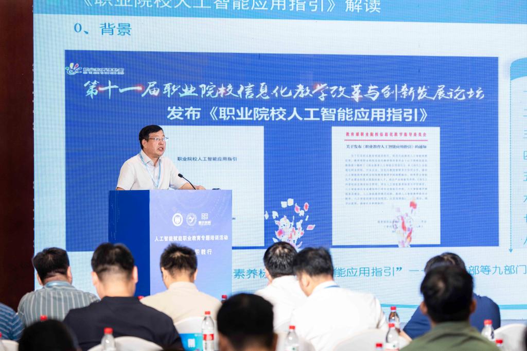 随后,教育部职业院校信息化教学指导委员会主任王钧铭教授对《职业院校人工智能应用指引》进行了深度解读。他站在时代发展的高度解析了标准出台的背景意义,并围绕AI在教学革新、管理优化、资源建设等维度的融合应用进行了系统阐述,为职业院校的数字化、智能化发展提供了遵循和指导。