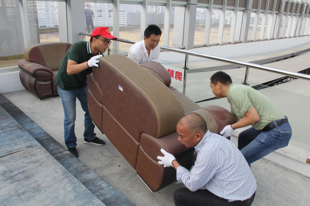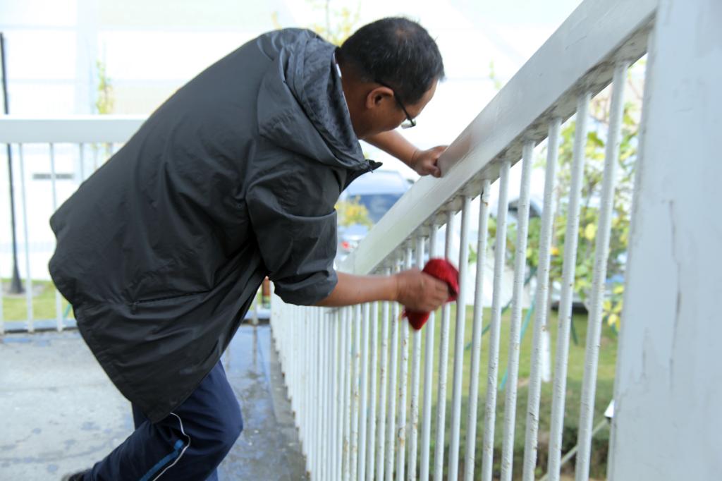 学校办公室根据行政楼实际情况,仔细梳理待清理项目,充分发挥性别优势,将行政人员分成三组,一组负责行政楼内护栏、玻璃、装饰画、盆栽、消防箱、应急通道等的清洁工作,一组负责行政楼内报废货物和杂物等搬离工作,一组负责行政楼周边草坪烟蒂、白色垃圾、排水沟等清理工作。在大家的共同努力下,经过整整3个小时的打扫,行政楼内部及周边环境焕然一新。