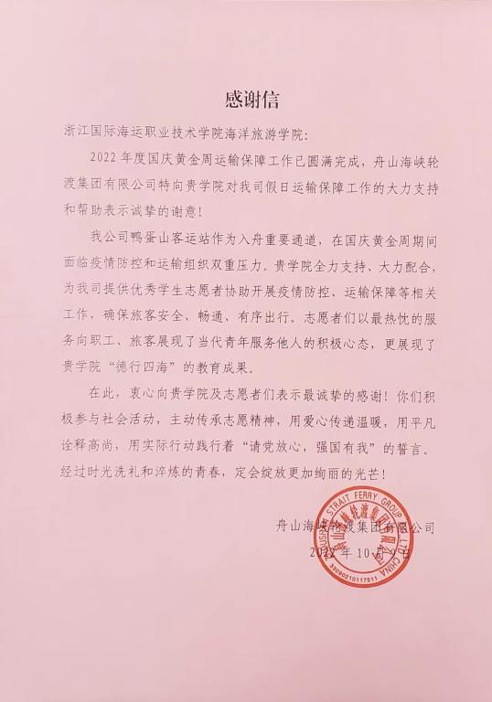 近日,舟山海峡轮渡集团有限公司向海洋旅游学院送来感谢信,对国庆期间学院志愿者鸭蛋山客运站志愿服务活动中的突出表现给予了高度的评价。