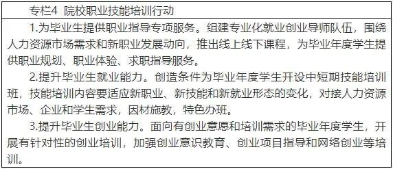 突出职业技术(技工)教育类型特色,深入推进改革创新,扩大技术技能人才培训规模。大力发展技工教育,支持技师学院建设。充分发挥职业院校培训资源优势,提升培训规范化、专业化水平。实施院校职业技能培训行动,动员和支持各类职业院校积极开展职业培训,推行“学历证书+职业技能等级证书”制度,积极为毕业年度学生提供职业技能培训服务并纳入职业培训补贴范畴。符合条件的职业院校可按规定承担政府补贴的职业技能培训任务。支持职业院校强化校企合作,为学生提供全方位技能培训服务。